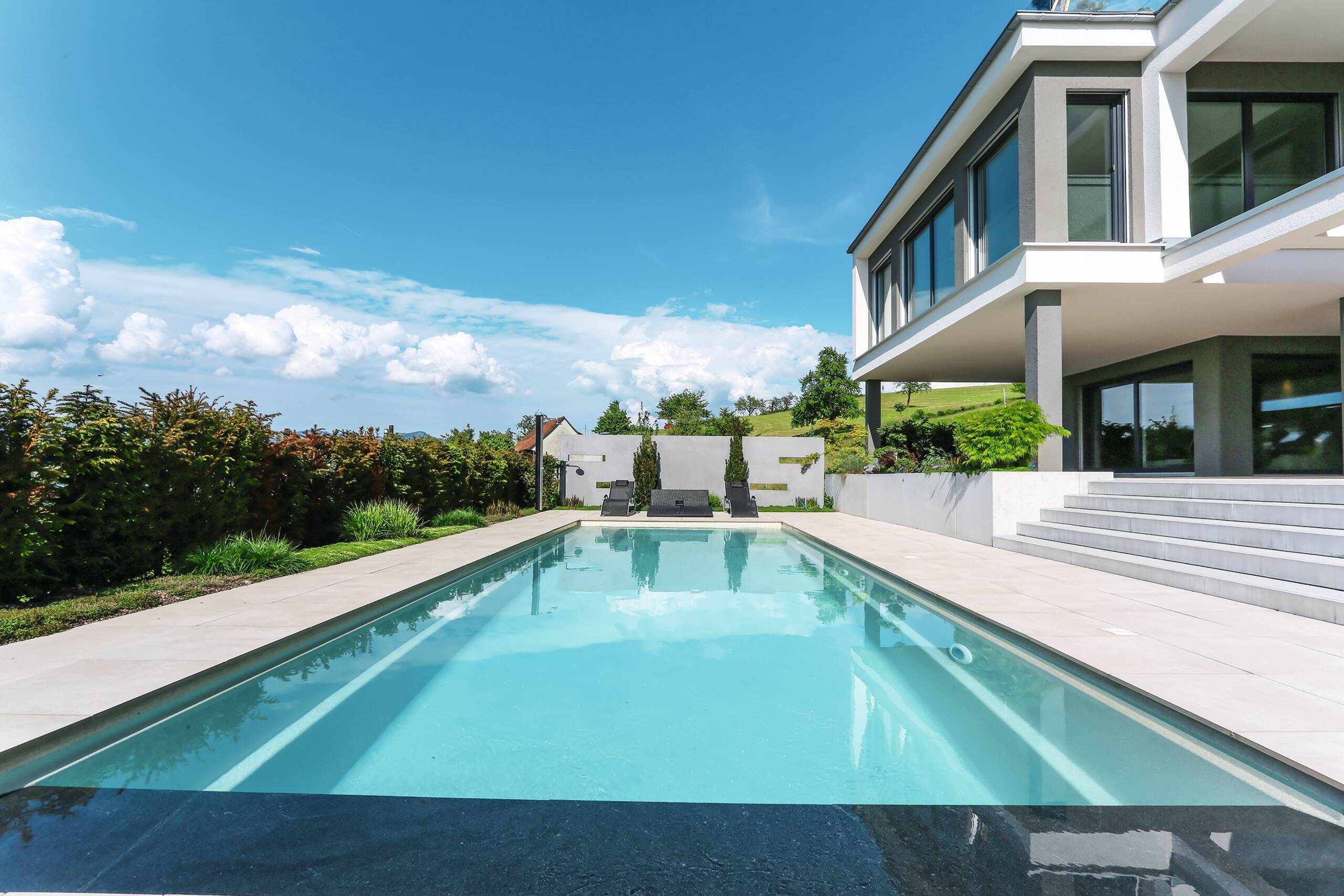 This stunning property, with gorgeous views over Lake Zurich, was built, piece by piece, by our master craftsmen at the WeberHaus factory in Germany. With over five decades of WeberHaus experience, our timber frame houses are custom-built to our clients’ requirements - incorporating our award-winning eco house design principles and bespoke design features throughout. This property’s exterior is ultra-modern - opting for sharp, clean-cut lines and an abundant use of greenery for a soft, natural touch. The large pool outside is enjoyed by all of the Mercanti family, while the sauna inside adds an extra layer of leisure they can enjoy in private. Explore the interior and you’ll find a modern aesthetic comprised of lavish furnishings and luxury materials, combined with a monochromatic colour palette. With the living space stretching over 313 m2, the Mercanti family can enjoy a whole storey constructed specifically for family recreation.