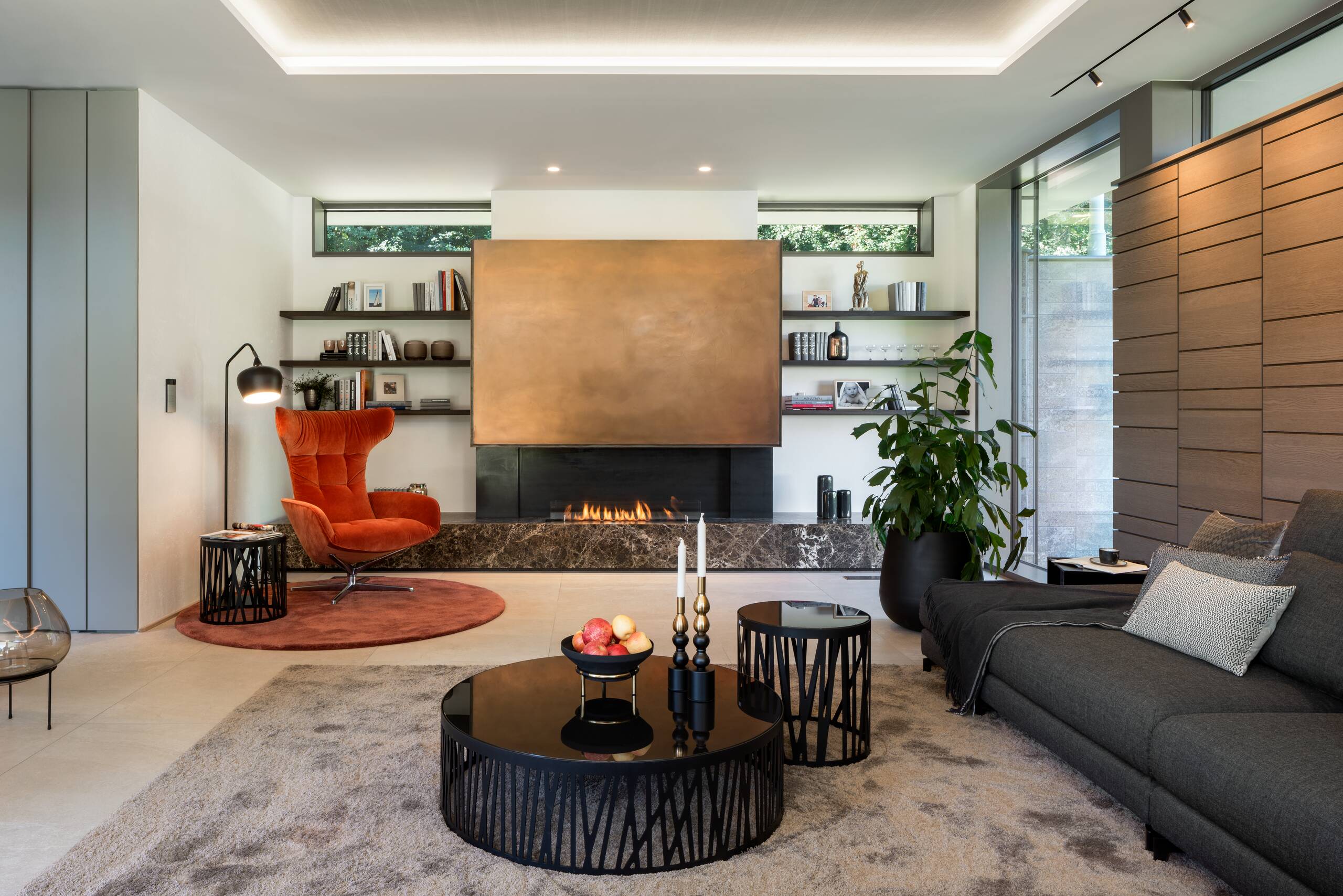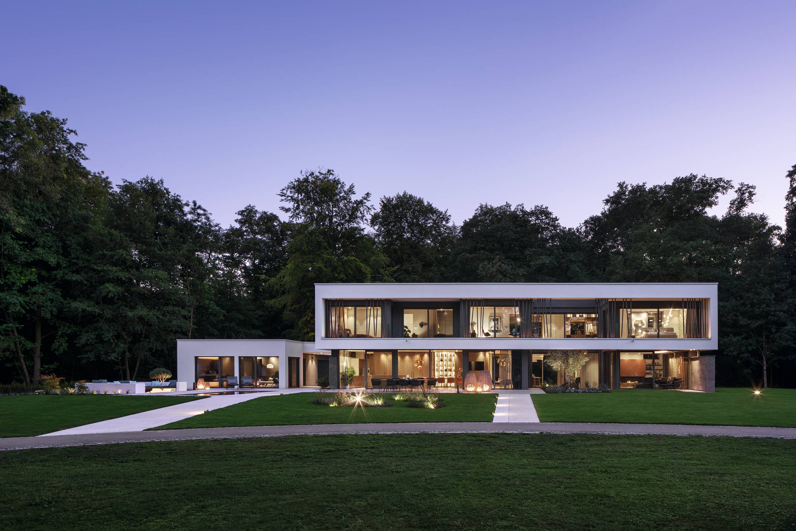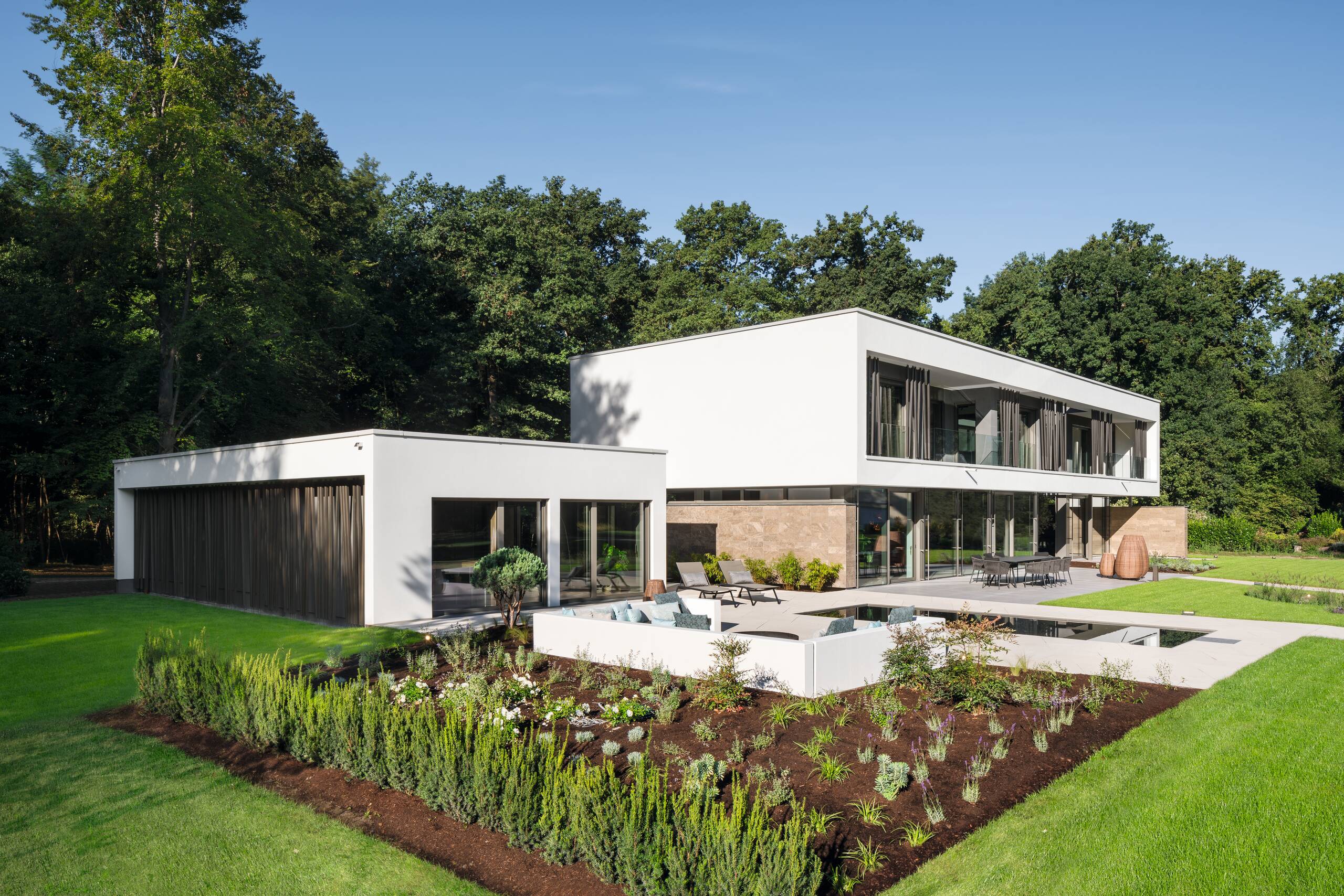 With its clear lines and modern architecture, this striking luxurious show house unmistakably reveals its origins in the Bauhaus tradition. The impressive turnkey home is the work of London-based architect, Nick Blunt. The house has a width of 25 metres long and a depth of 9 metres. Large floor-to-ceiling glazed elements open the detached house to the garden side, letting plenty of daylight into the interior. With a total floor area of 335 m², the spaciousness and generosity of the layout is immediately apparent on entering the house. The entrance floor is divided into a living room, which can be unobtrusively hidden by a floor-to-ceiling door integrated into the wall. The second area consists of an open kitchen-dining area. Ancillary rooms such as a storeroom, a WC, the lift and a concealed bar are configured on the ground floor like free-standing floor-to-ceiling items of furniture. On the first floor is the parents’ suite with bedroom, wellness bathroom and a generously proportioned dressing room. The remainder of the available first floor space comprises two children’s bedrooms, each with their own en suite bathroom and an office. A separate free-standing building next to the main building contains the double garage, and a wellness area with sauna, WC and Aquamoon shower. The high quality of the detailing and craftsmanship are particularly noticeable. Nothing in this villa is standard.