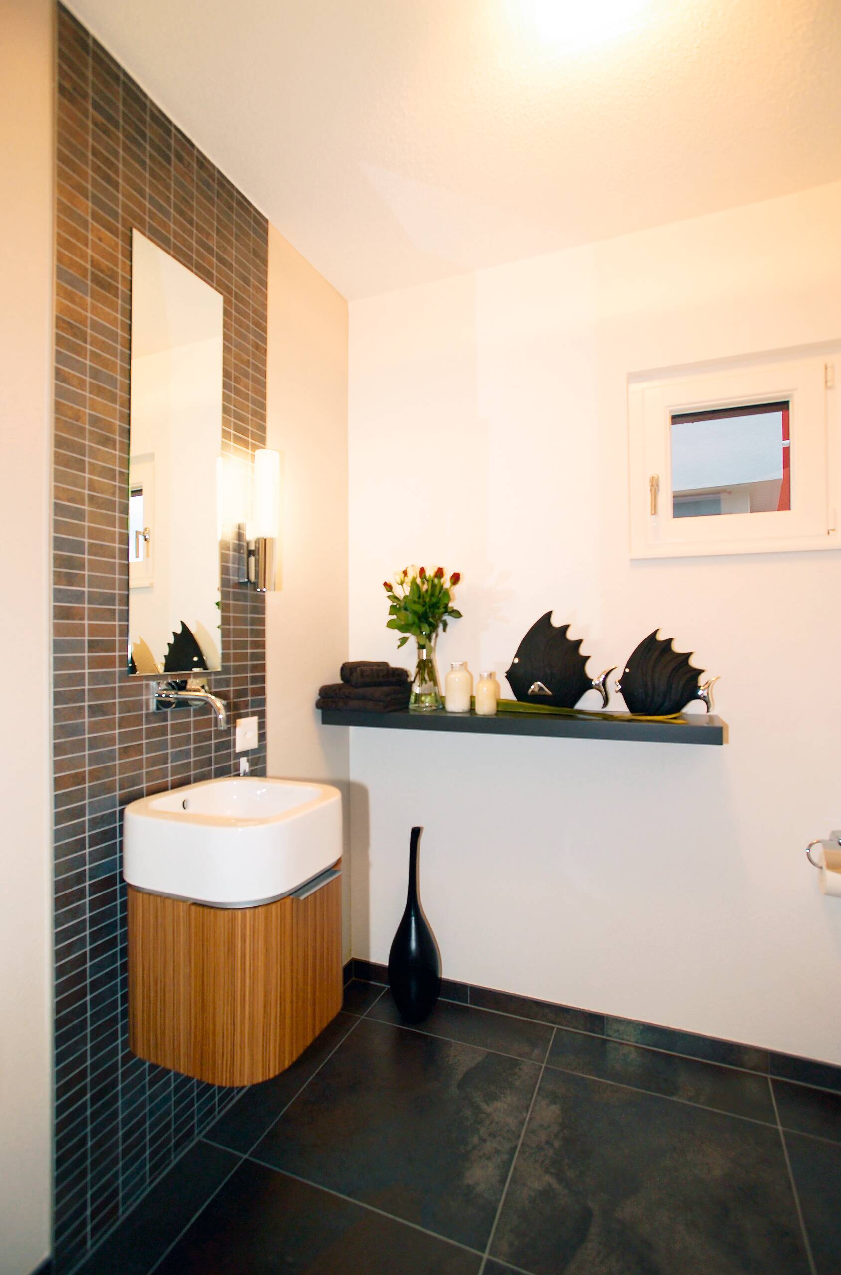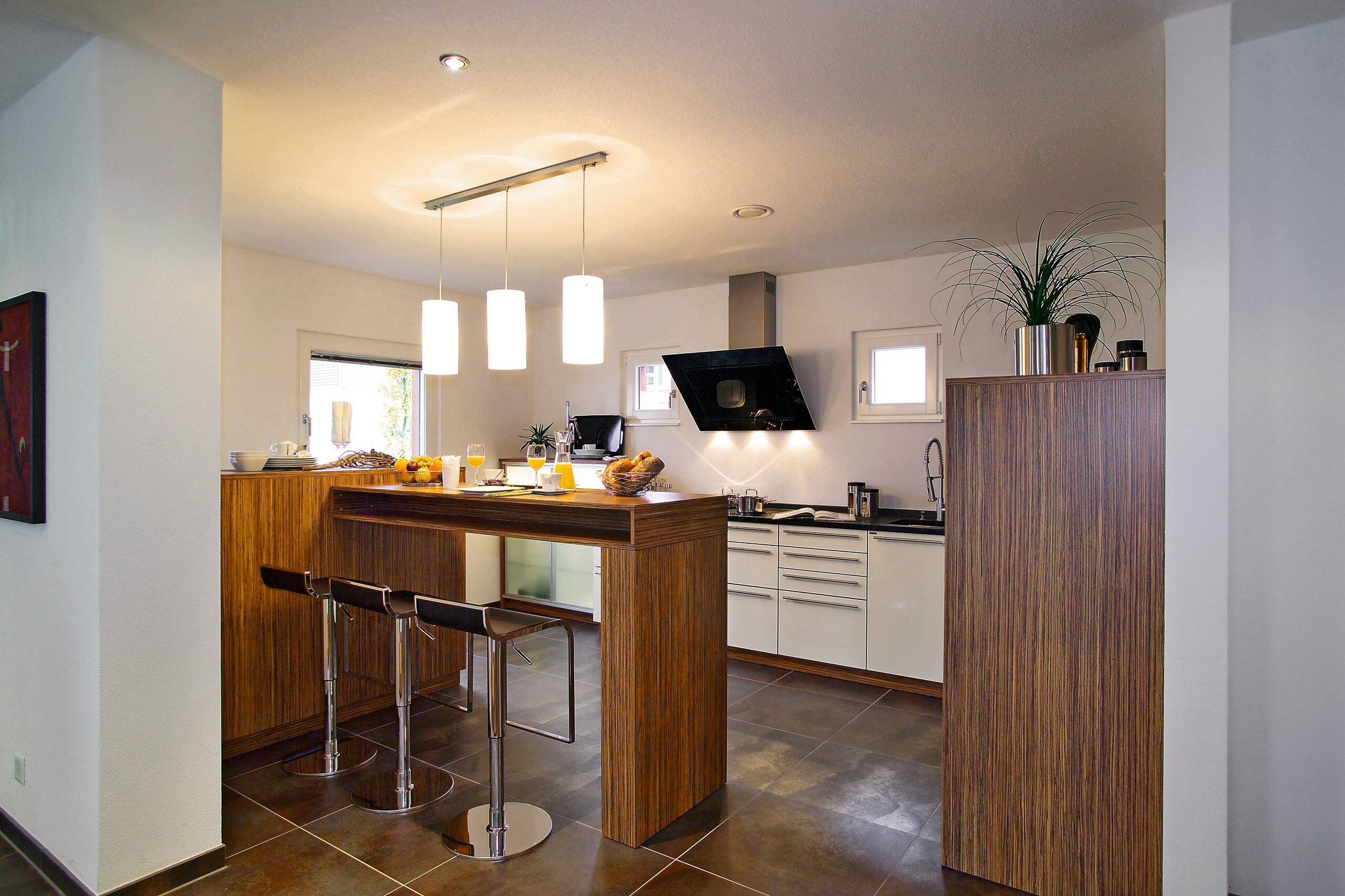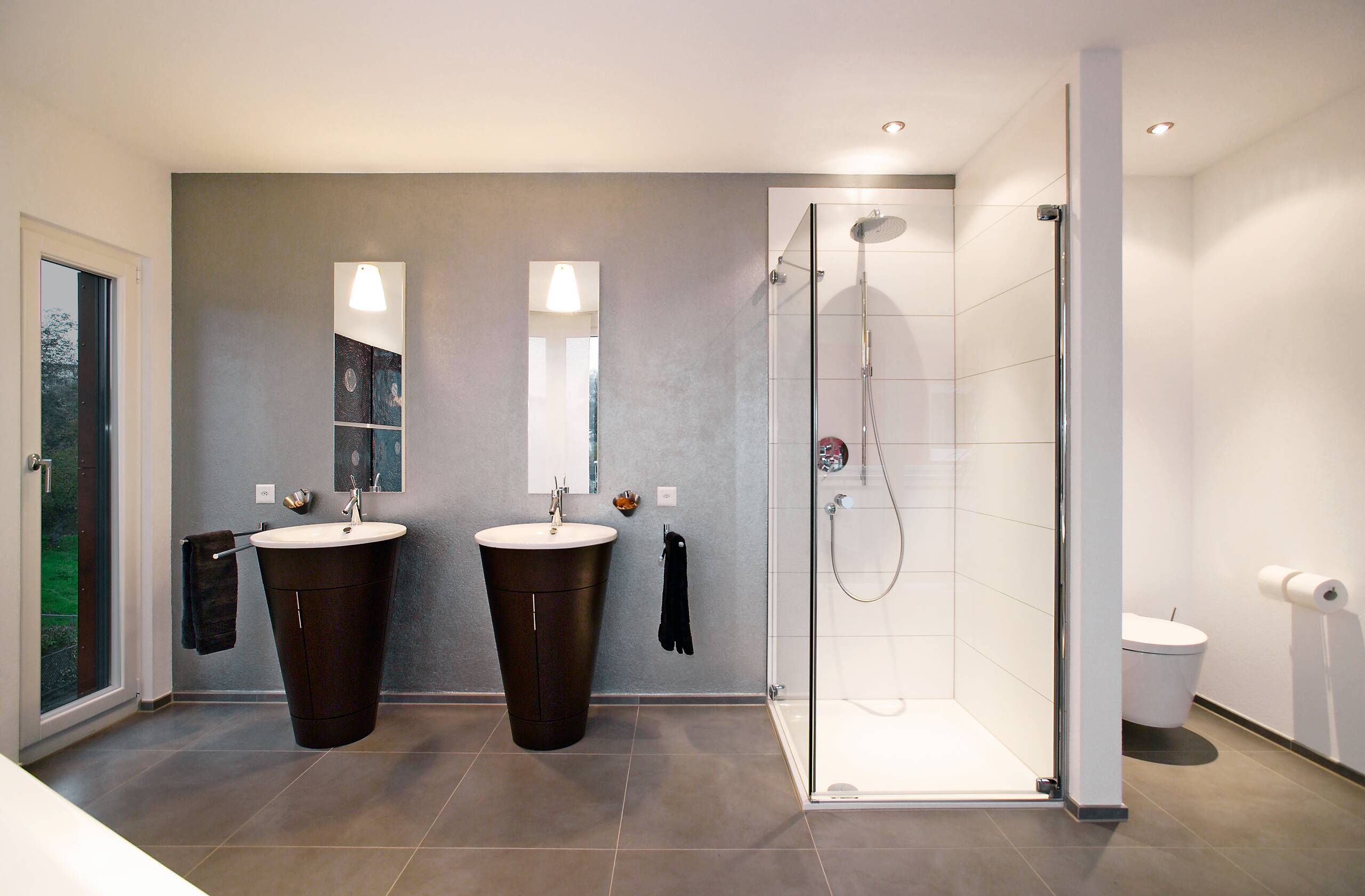 The design presents modern living in a clear design language combined with intelligent construction methods. The structural shell, materials, forms and colours thus form a harmonious unit. The building consists of two cubes, where the first two-storey cube forms the basis of the design. The structure is emphasised by the dark facade panels and the white render. Large-format floor tiles in the entrance area reflect the generosity of the design. The interior layout is open, communicative, and straightforward, with a clear organisation of the functional and retreat spaces. The design of the spaces both on the ground floor and on the first floor enable all variations of the floor plan design due to the central position of the staircase. In addition, the attic floor, with its roof terrace, forms an attractive setting for discussions with customers and new prospects.
