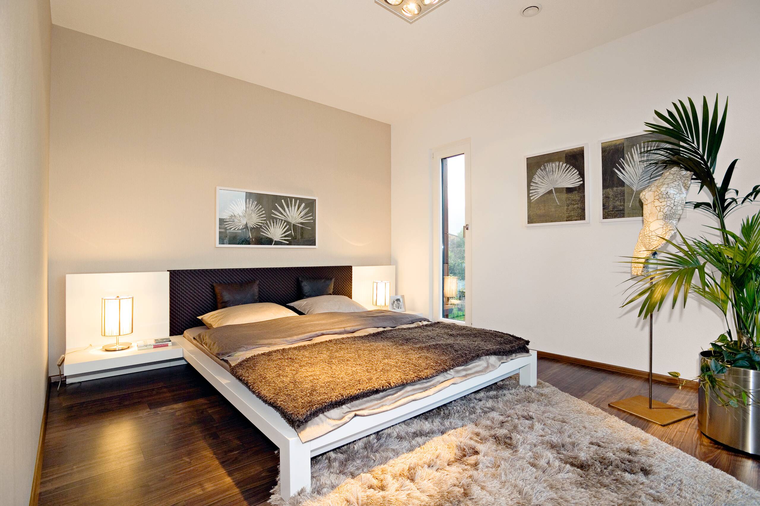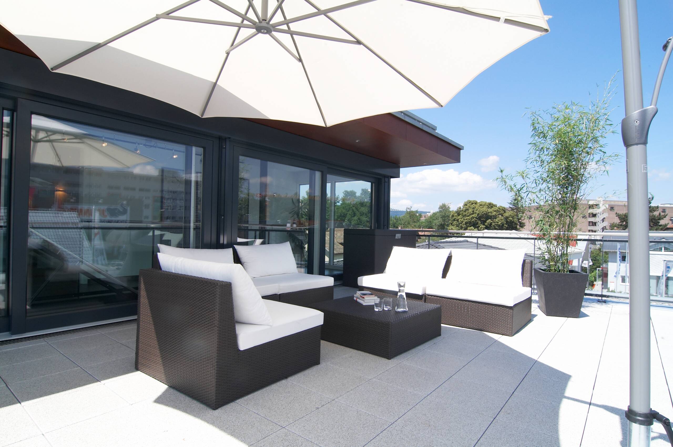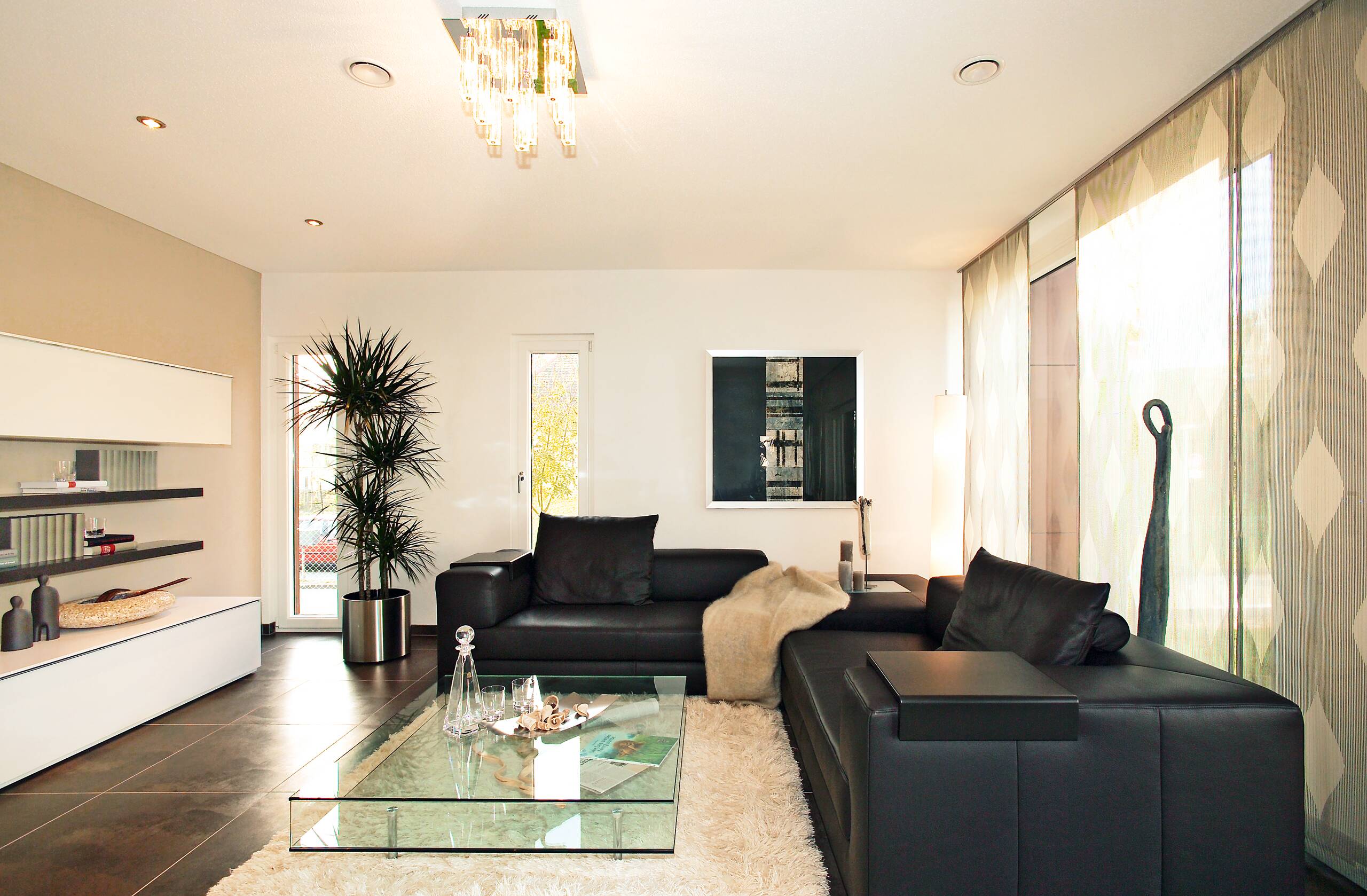 The design presents modern living in a clear design language combined with intelligent construction methods. The structural shell, materials, forms and colours thus form a harmonious unit. The building consists of two cubes, where the first two-storey cube forms the basis of the design. The structure is emphasised by the dark facade panels and the white render. Large-format floor tiles in the entrance area reflect the generosity of the design. The interior layout is open, communicative, and straightforward, with a clear organisation of the functional and retreat spaces. The design of the spaces both on the ground floor and on the first floor enable all variations of the floor plan design due to the central position of the staircase. In addition, the attic floor, with its roof terrace, forms an attractive setting for discussions with customers and new prospects.