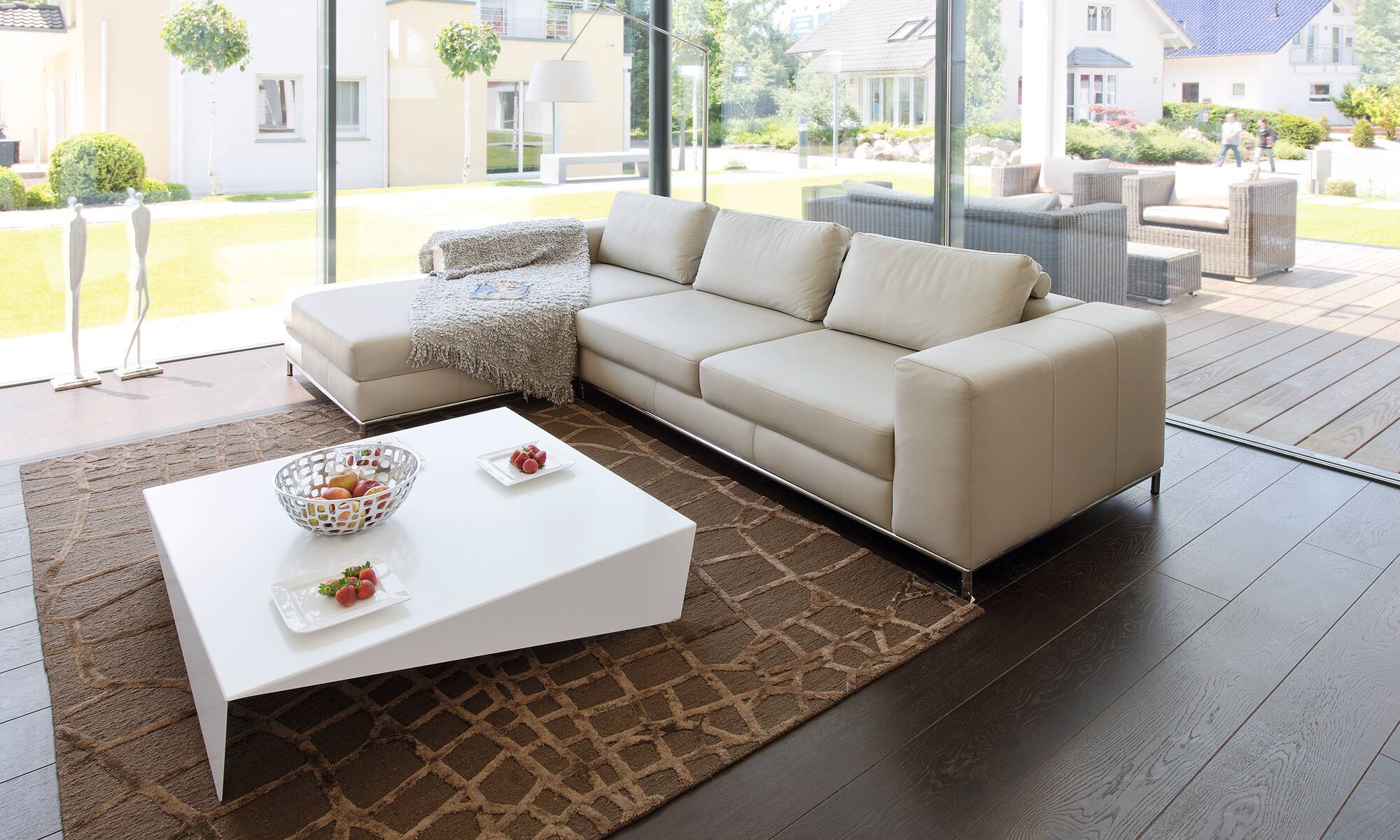 This WeberHaus, based on our ebenLeben home architecture concept, offers the perfect combination of modern comfort and stylish aesthetics. The exterior was designed in a modern style that pairs white walls with anthracite-grey accents and dark brown cladding, and a small sheltered patio area provides a pleasant space for homeowners to relax. This architect-designed home was built to be highly accessible, with a single-storey used to create a surprisingly spacious interior. Inside, a stunning modern look presides - with warm wooden flooring contrasting against white fittings and walls for a striking appearance. The large, frameless floor-to-ceiling glass sliding doors looking onto the patio allow plenty of light to enter the home and build an airy, bright atmosphere.