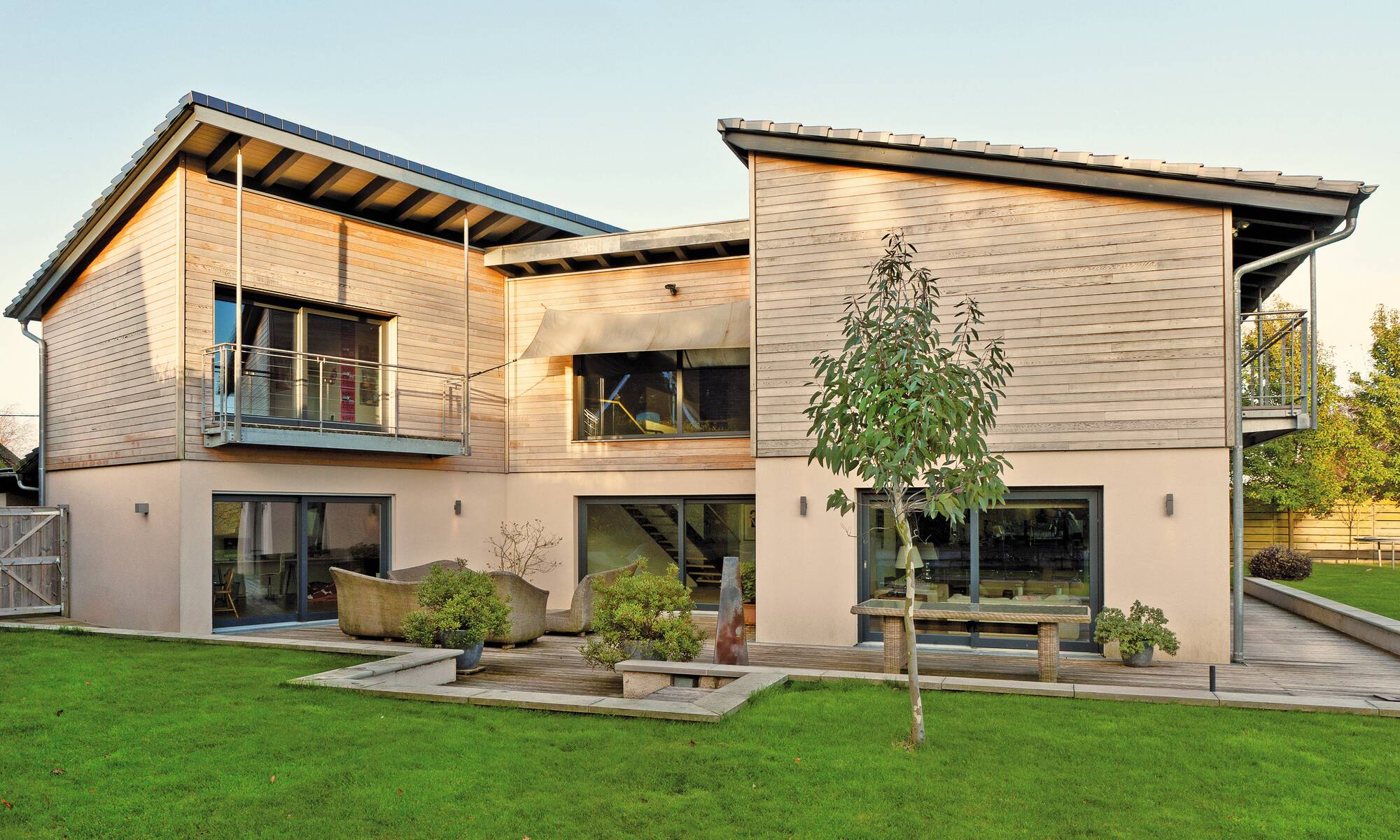 This elegant prefabricated home has a simple, understated exterior that leads into a gorgeous interior full of design intricacies and surprises. Timber cladding complements a natural-coloured wall below, with organic furniture providing a fitting reflection of this eco-friendly home. Inside, a double-height atrium takes centre-stage - its dramatic height and open-topped format providing an inside/outside space for family and friends to soak up the sun or eat meals in private. A steel and glass bridge links two sections of the first floor, while large sliding glass doors at the rear incorporate level thresholds to create a seamless transition from indoor to outdoor living.