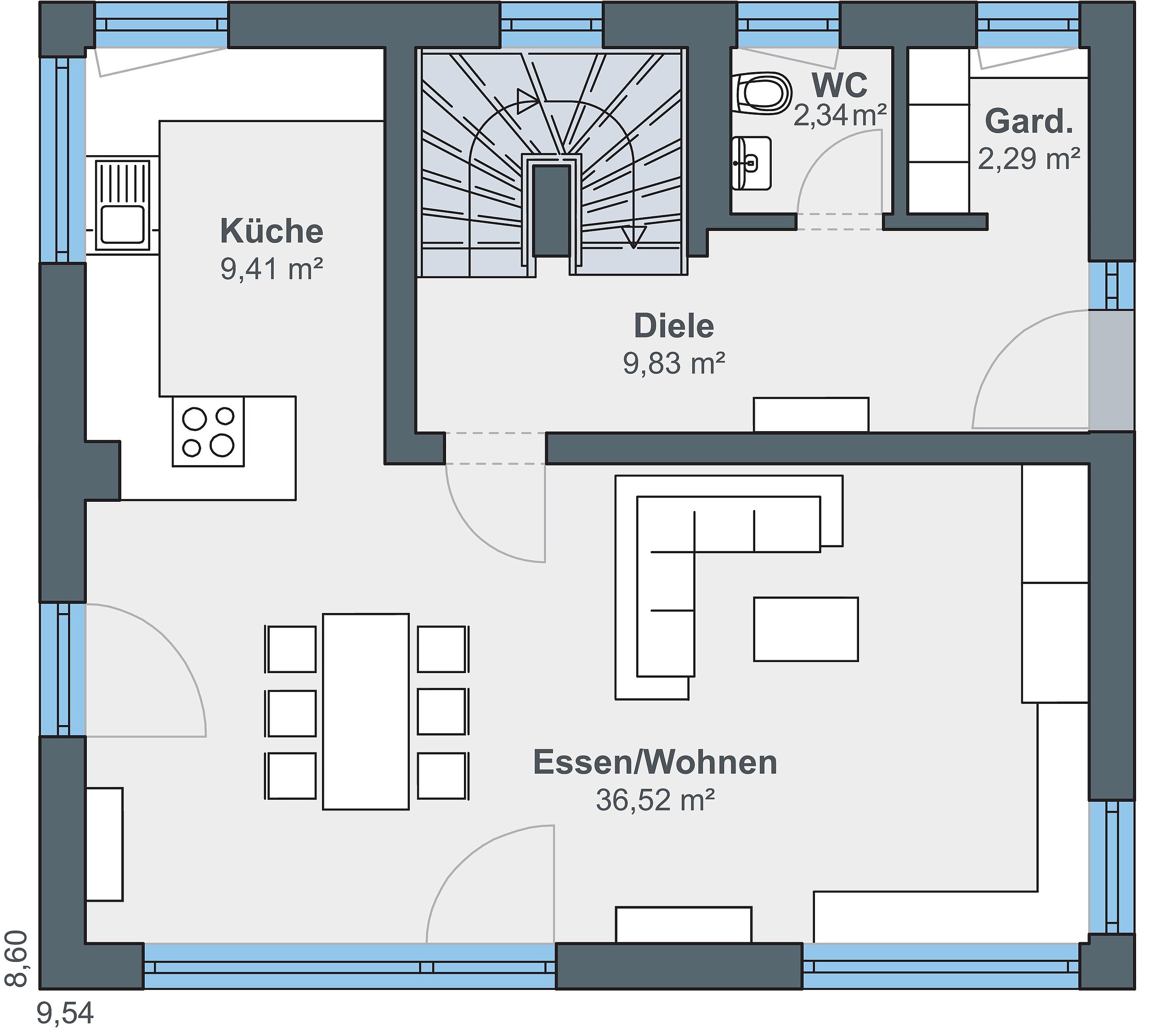 Das Familienleben spielt sich auf drei Geschossen ab. „Um nicht zu viel Grundfläche zu versiegeln, haben wir einen Keller einplanen lassen. Er wird als Werkstatt, Büro, Hobbyraum und Lager genutzt,“ erklärt Sonja Keller. Mittelpunkt des Alltagsgeschehens bildet das Erdgeschoss, wo sich die großzügigen Gemeinschaftsräume, ergänzt von einem Gäste-WC und einer praktischen Garderobe, befinden. Der Grundriss wurde weitgehend offen gestaltet, sodass sich das Tageslicht, das über die großen Fenster in die Räume gelangt, ungehindert bis in jeden Winkel ausbreiten kann. Das Dachgeschoss, das dank des hohen Kniestocks Kopffreiheit bietet, beherbergt mit zwei Kinderzimmern, dem Elternschlafraum und dem gemütlichen Familienbad die privaten Ruhe- und Rückzugsbereiche der Familie.