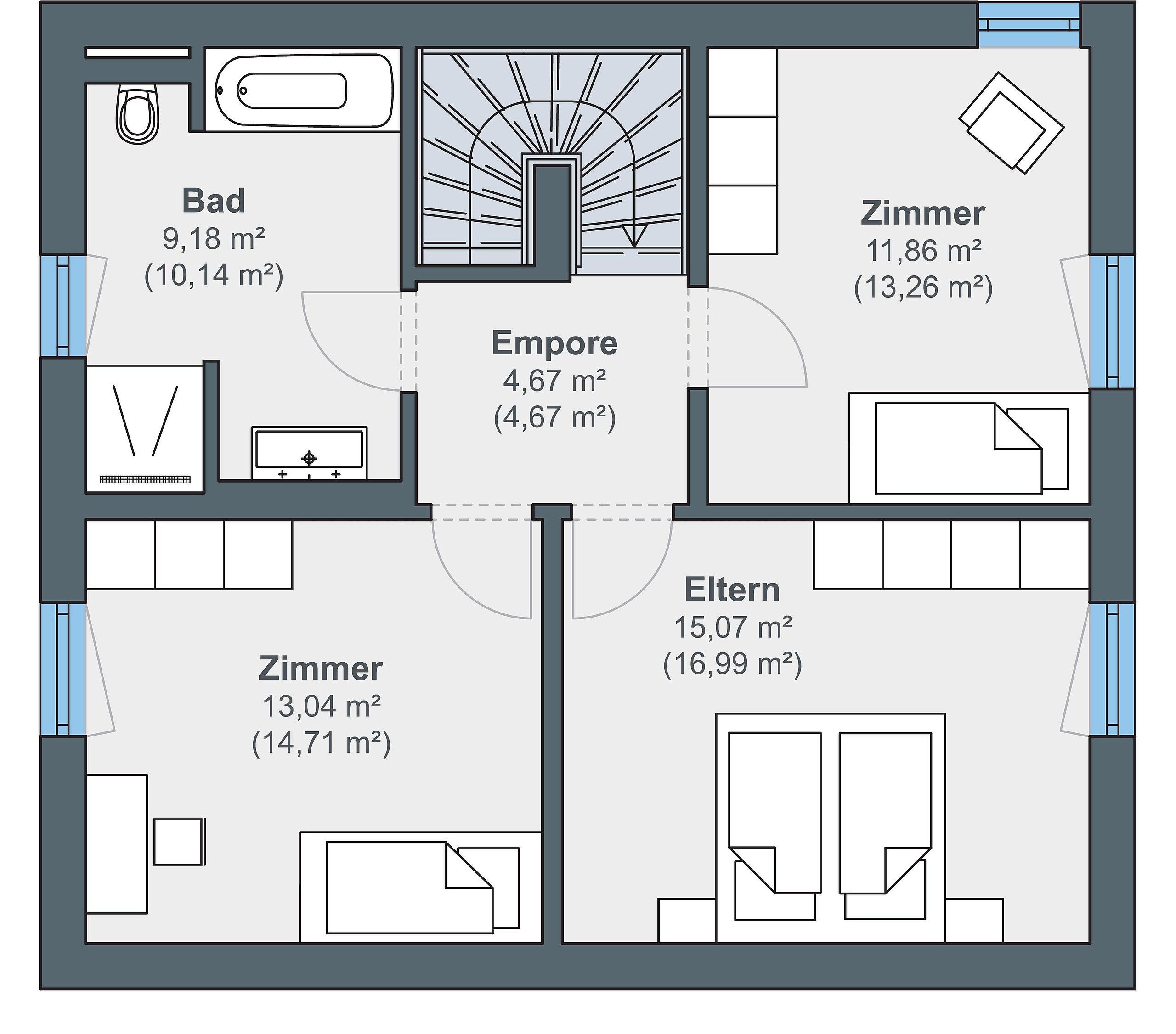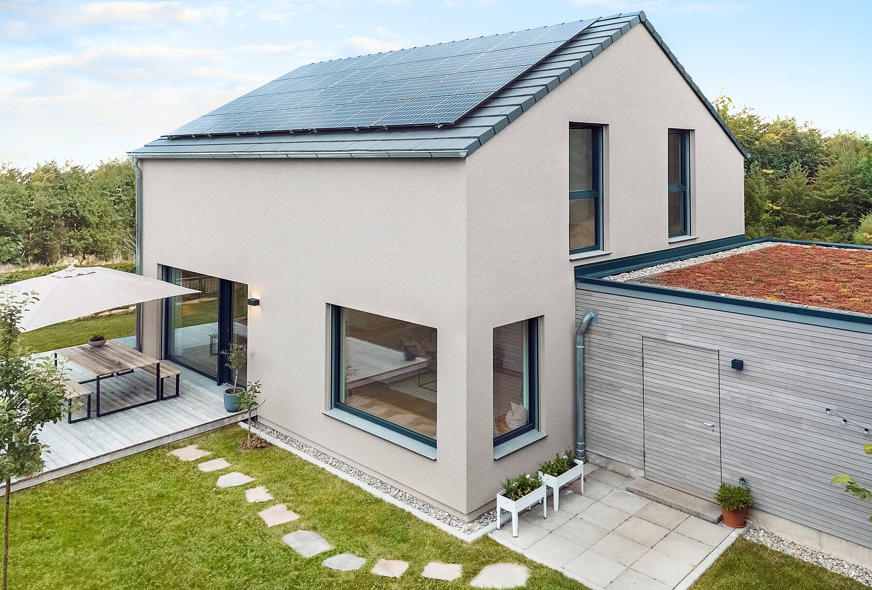 Die Basis für einen möglichst geringen CO2-Fußabdruck legt die Gebäudehülle ÖvoNatur Therm, die Standard in jedem WeberHaus ist. Sie besteht vorwiegend aus dem klimaneutralen und nachwachsenden Baustoff Holz, der mit weiteren natürlichen Materialien kombiniert wird. Die eingesetzten Werkstoffe sind auf ihre Umwelt- und Gesundheitsverträglichkeit geprüft. Dank der hervorragenden Wärmedämmeigenschaften der Gebäudehülle werden die Wärmeverluste im Winter auf ein Minimum reduziert. Im Sommer bleibt es dagegen angenehm kühl in den Räumen. So muss weniger Energie zum Heizen und zum Kühlen aufgewendet werden. Der geringe Wärmebedarf wird über eine umweltfreundliche Heiztechnik gedeckt. Familie Keller entschied sich zudem für eine leistungsstarke Photovoltaikanlage, die einen Großteil des im Haushalt benötigten Stroms liefert. Gesteuert werden sämtliche technischen Komponenten über das Smart-Home-System WeberLogic 2.0.