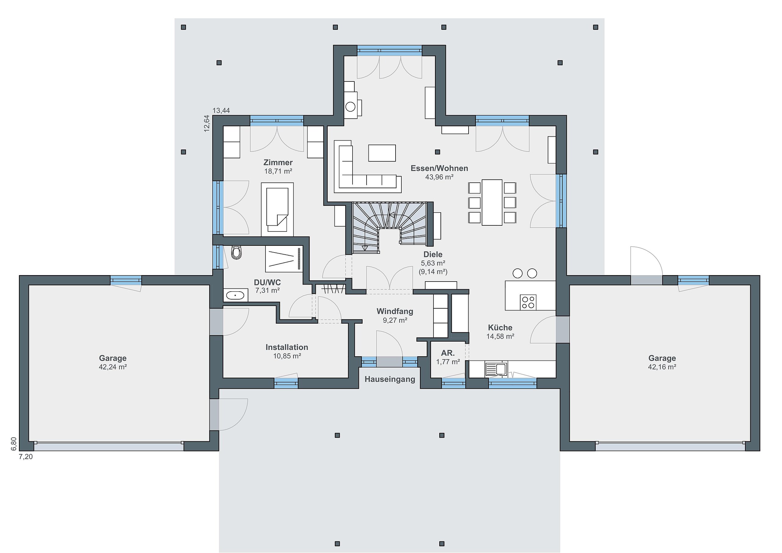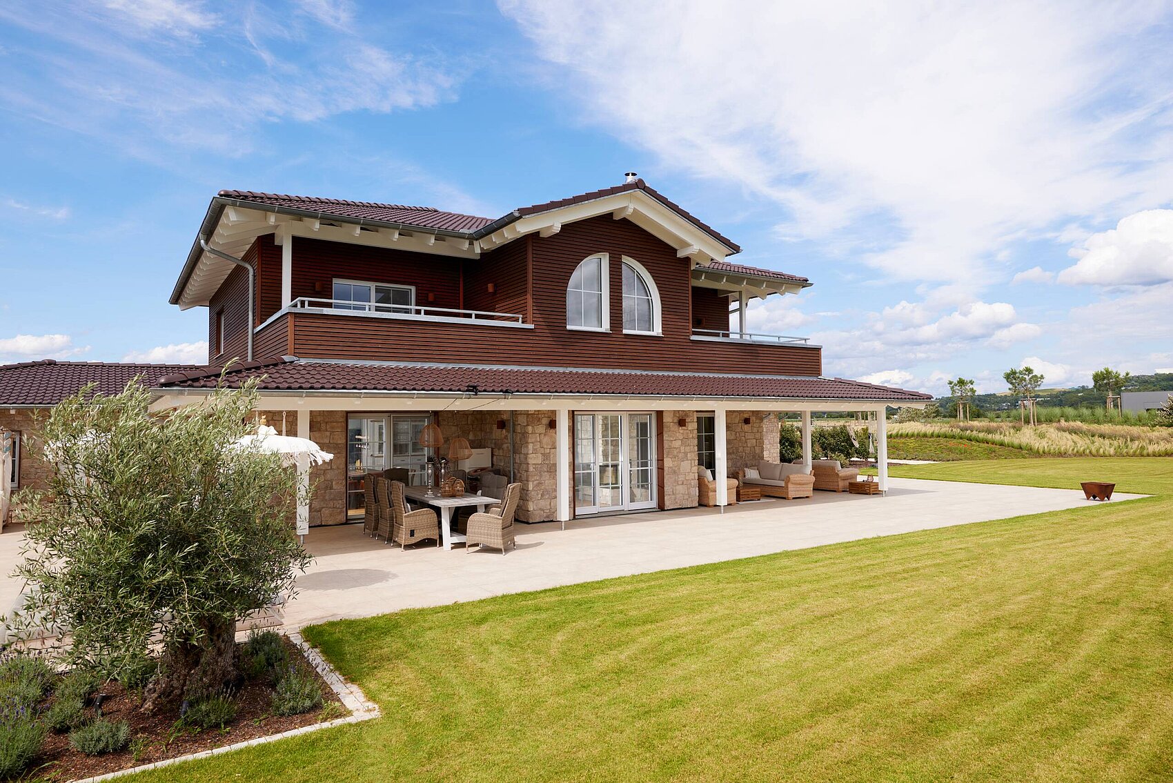 Wer denkt, dass schon die Vorderansicht spektakulär ist, der sollte sich einmal um das Haus herumbewegen. Die Gartenseite wird dominiert von großzügigen, teilweise raumhoch ausgeführten Fenstern und Fenstertüren, die Zugang zu den gemütlichen Freisitzen bieten. Blickfang ist der mittig platzierte Erker mit den zwei angrenzenden Loggias, die auf der Terrassenüberdachung thronen. Hier kann man sich nach einem anstrengenden Arbeitstag wunderbar entspannen und die Seele baumeln lassen. An warmen Sommertagen lädt das kristallklare Wasser im Pool zum Abkühlen ein.