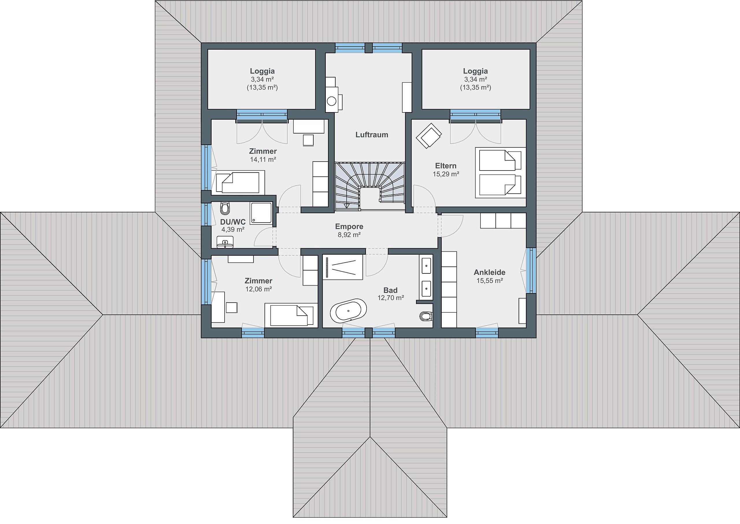 Über eine moderne, halbgewendelte Holztreppe gelangt man in das Dachgeschoss, das die privaten Ruhe- und Schlafbereiche beherbergt. Empfangen werden die Bewohner von einer luftigen Empore. Rechts liegt der Elterntrakt mit Schlafzimmer, großer Ankleide und Badezimmer, links befinden sich zwei Kinderzimmer mit eigenem Kinderbad.