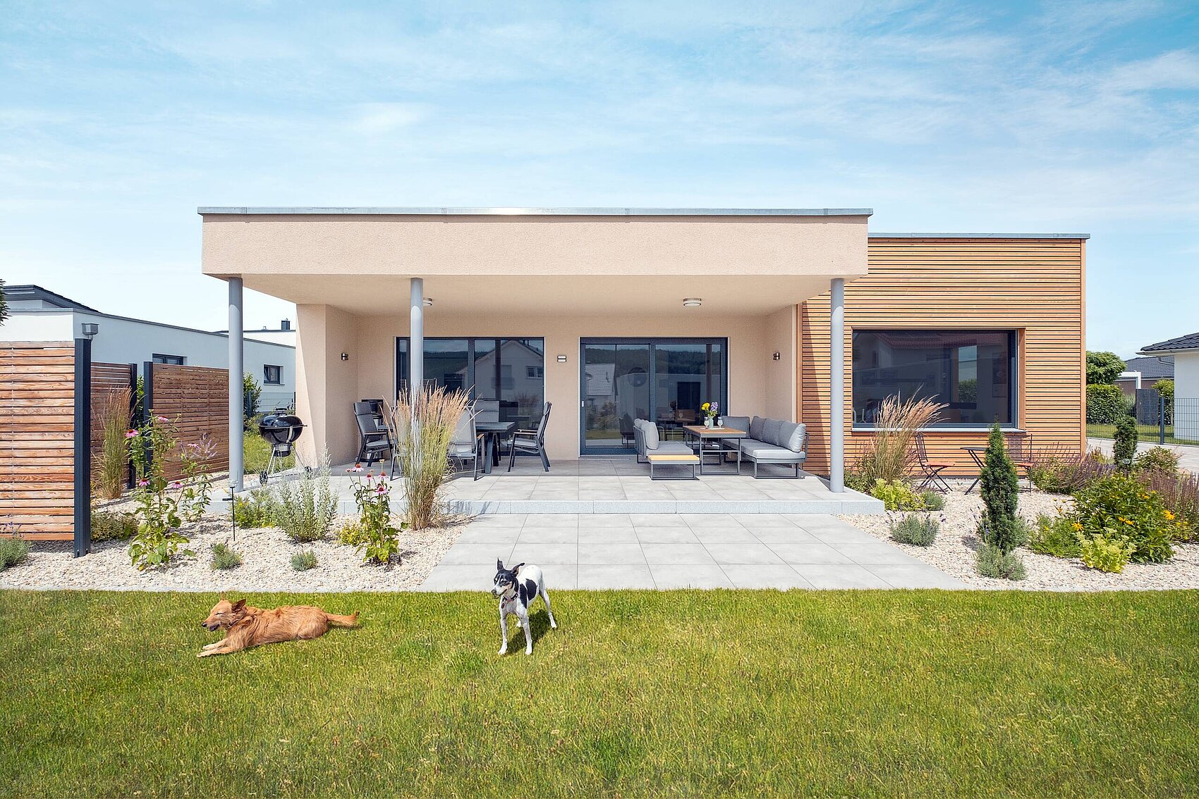 Die Basis für das neue Eigenheim bildet ein vorgeplanter Fertighaus-Bungalow aus der WeberHaus-Baureihe myLife. „Die Baureihe passte einfach perfekt – nicht nur wegen des Preisvorteils, sondern auch aufgrund der kompakten Form. Wir wollten das Grundstück optimal ausnutzen“, erklärt Dieter Schicker. Wie alle vorgeplanten Entwürfe von WeberHaus bieten auch die myLife-Bungalows einen großen Gestaltungsspielraum: vom klassischen Stil mit Walmdach bis hin zum nüchternen Bauhauslook ist alles möglich. Andrea Heinz und Dieter Schicker entschieden sich für einen eleganten Flachdachbau, den sie in einen warmen Ockerton hüllten: „Wir lieben den modernen Bauhausstil mit seinen klaren Linien und dem Fokus auf das Wesentliche, aber eben auch das mediterrane Flair. Ziel war es, beides zu verbinden. Unser Bungalow sollte anders sein, als die weiß-grauen Häuser im Baugebiet.“ Akzente setzt die honigfarbene Holzverschalung, die eine Verbindung zur Natur und den verwendeten Baustoffen herstellen soll. „Mit der Holzfassade erhält das Haus zudem einen einladenden Charakter, der der Reserviertheit des Bauhausstils entgegenwirkt.“
