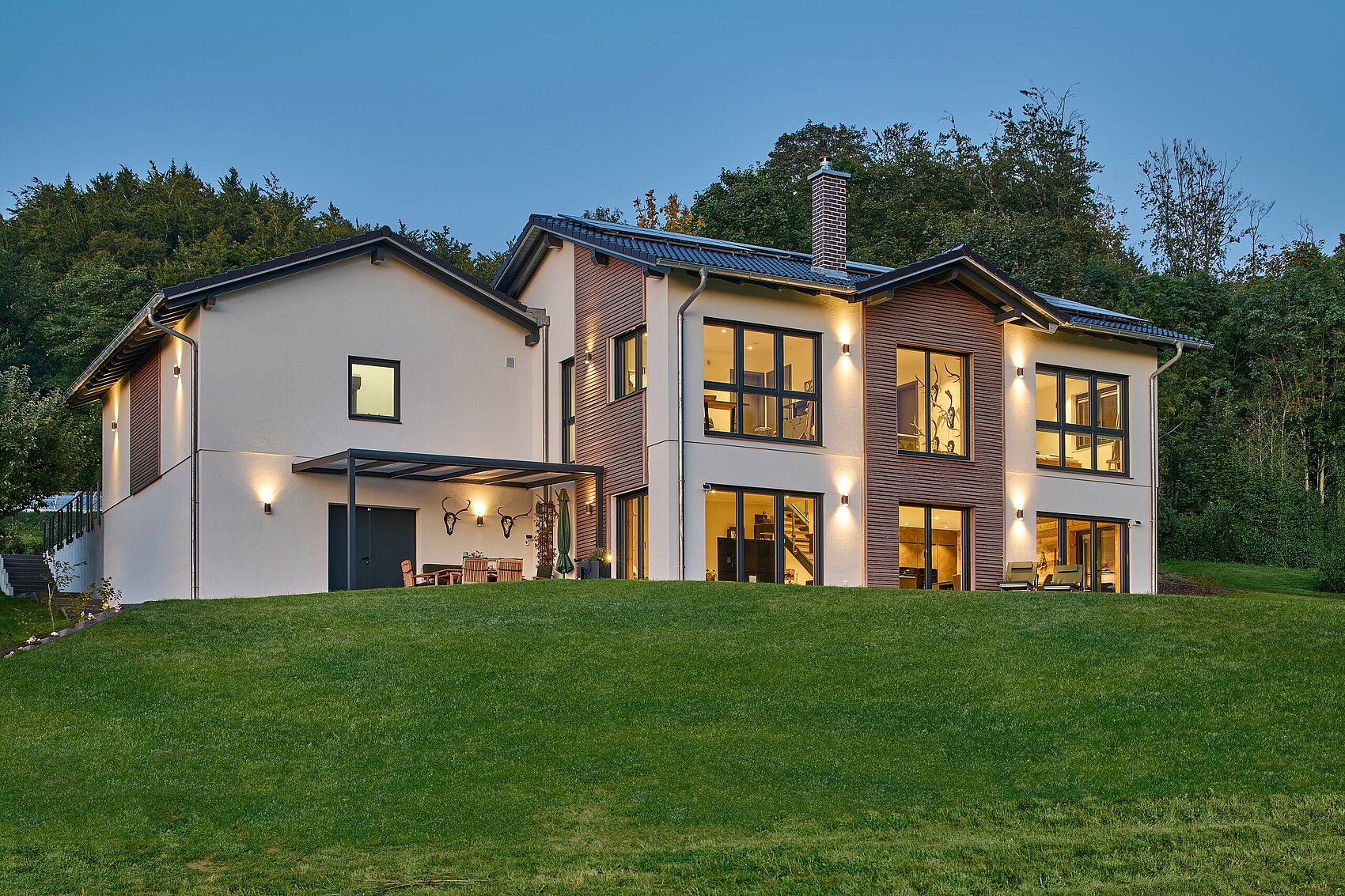 Nähert man sich dem Haus über die Dorfstraße, könnte man meinen, es handele sich um einen Bungalow mit Garagenanbau. Erst in der Seitenansicht zeigt sich, dass das Gebäude sanft in einen Hang hineingeschoben wurde. So entsteht ein lichtdurchflutetes Untergeschoss mit Zugang in den Garten. Schon von außen wird die Verbundenheit der Eheleute zur Natur und zur Region deutlich: Blickfang sind die partiellen Holzverschalungen, die dem Neubau einen heimeligen, warmen Charakter verleihen. „Sie bestehen aus Altholz, das aus alten Häusern und Schuppen geborgen wurde“, berichtet Charlotte Pflüger. Die Geweihe über dem Garagentor und unter dem Terrassendach spiegeln die gemeinsame Leidenschaft zur Jagd wider.