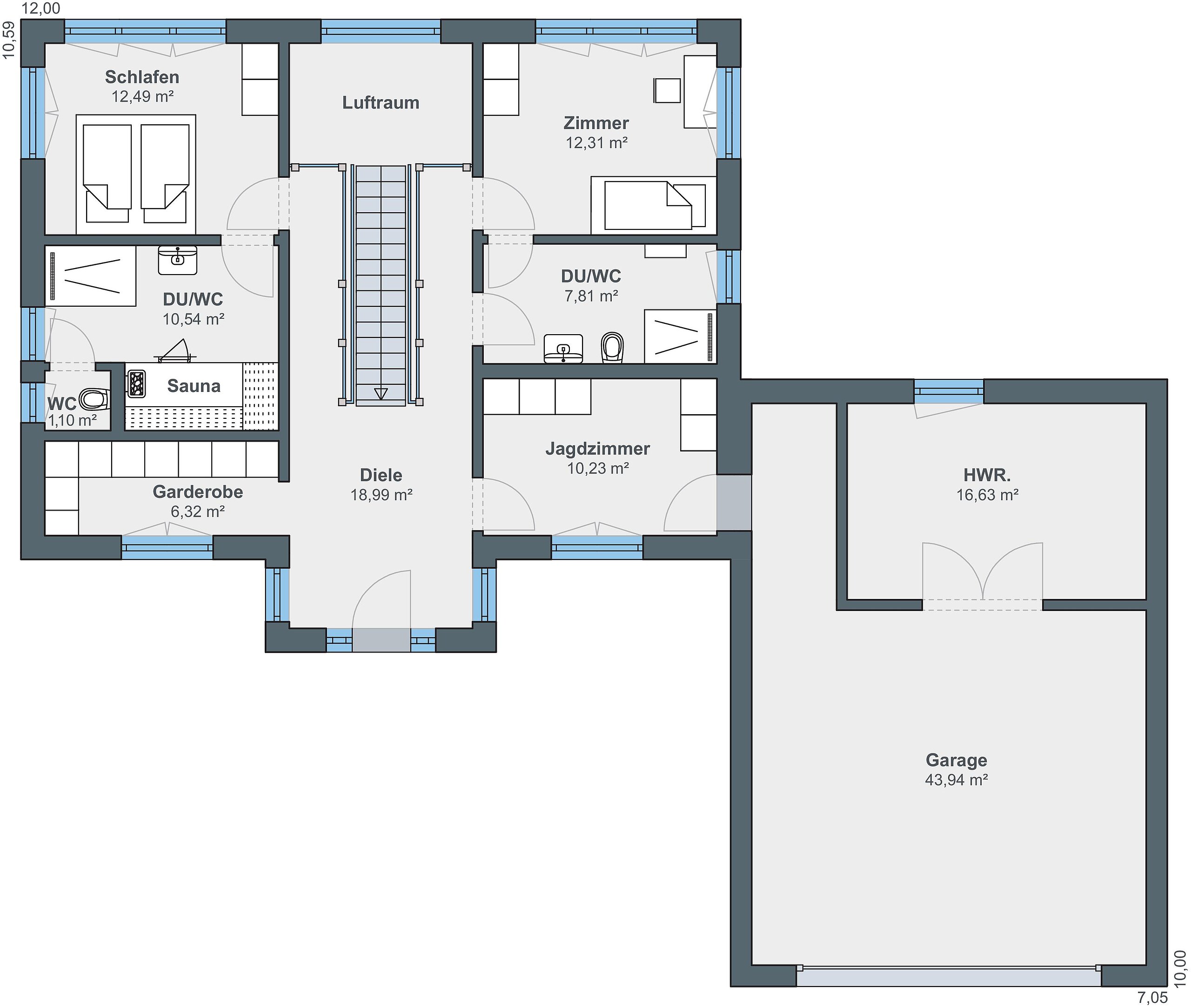 Betreten wird das Haus über den mittig platzierten Eingangserker. Hinter der Haustür findet man sich in einer repräsentativen, hellen Diele wieder, die mit den ländlichen, teilweise antiken Möbeln und Dekoobjekten sowie den großzügigen Holzoberflächen bereits einen Vorgeschmack auf das weitere Interieur gibt. „Zentrales Element in der Planung meines Mannes ist die Treppe. Sie trennt den Schlafbereich mit Bad und Sauna auf der linken Seite vom kombinierten Gäste-, Arbeits- und Sportzimmer und dem Gästebad“, erklärt Charlotte Pflüger. Komplettiert wird das Raumprogramm von einer Garderobe und einem Jagdzimmer. „Hier werden die jagdlichen Gegenstände aufbewahrt, zudem gibt es einen Durchgang zur Garage. So kommen schmutzige Stiefel und Kleidungsstücke gar nicht erst ins Haus.“